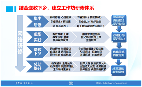3. 結(jié)合送教下鄉(xiāng),建立工作坊研修體系--網(wǎng)絡(luò)研修、集中研修、現(xiàn)場(chǎng)實(shí)踐和送教下鄉(xiāng)相結(jié)合。