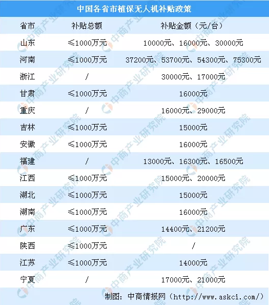 目前,進入補貼試點的省市已有浙江、安徽、江西、湖南、廣東、重慶、吉林、福建、甘肅、江蘇等十余個省市。在整體試點資金安排上,基本為千萬元量級。政策支持下植保無人機市場在全國就進入快速發(fā)展期。