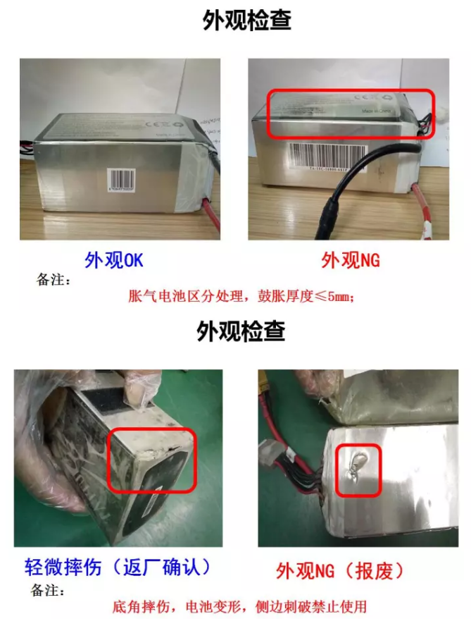 外觀判定:出現(xiàn)明顯鼓脹、破損、漏液、變形現(xiàn)象;